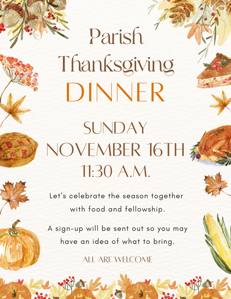 This month the Parish Supper will be an All Parish Thanksgiving Dinner around 11:30 a.m. on Sunday, November 16th.